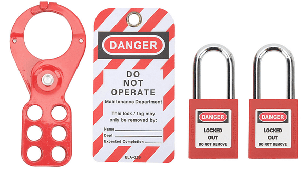 Thiết bị được gắn khóa và thẻ cảnh báo theo quy trình Lockout – Tagout (LOTO) nhằm kiểm soát nguồn năng lượng nguy hiểm.